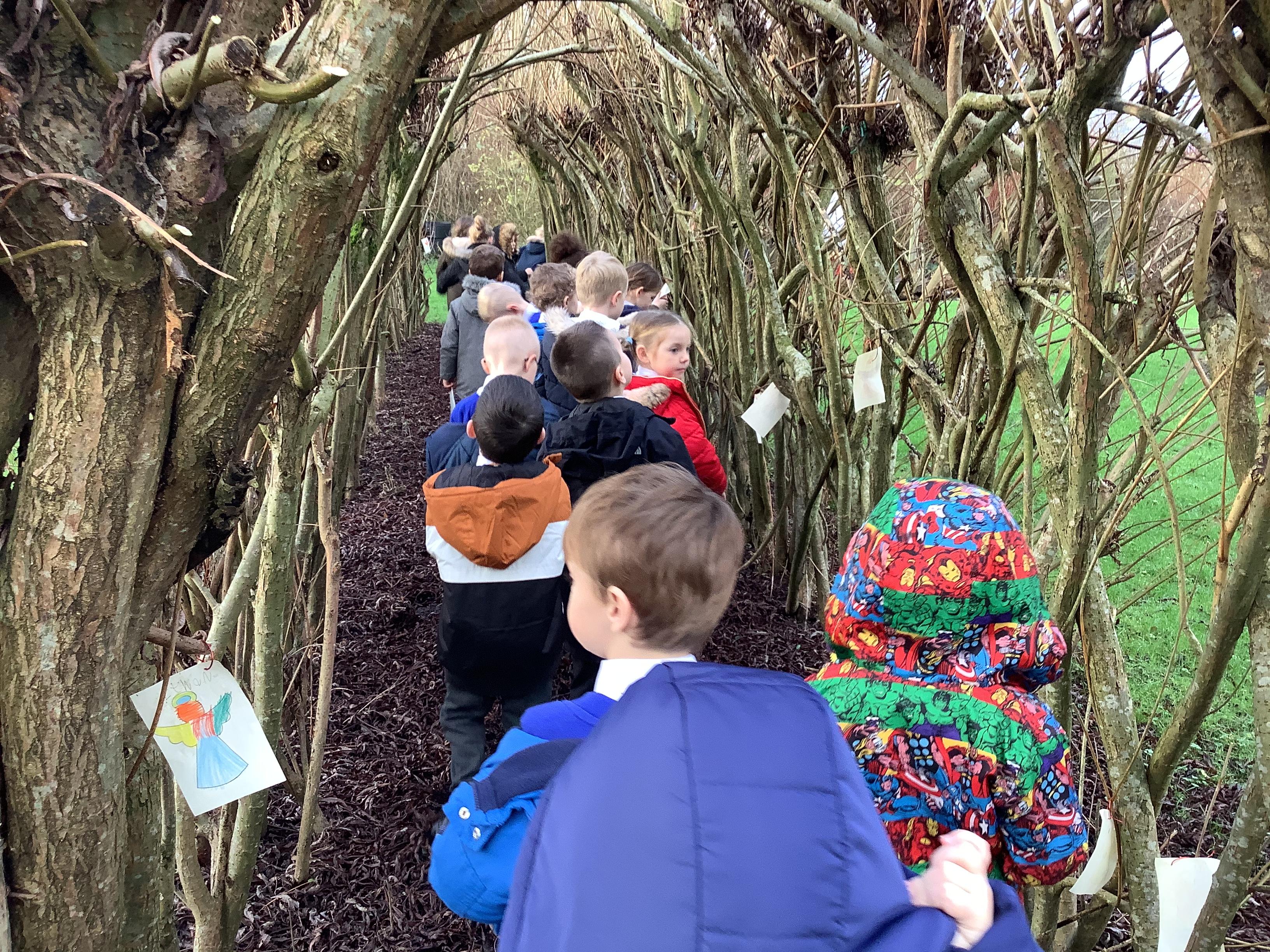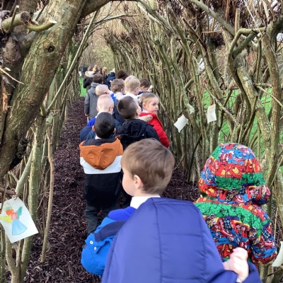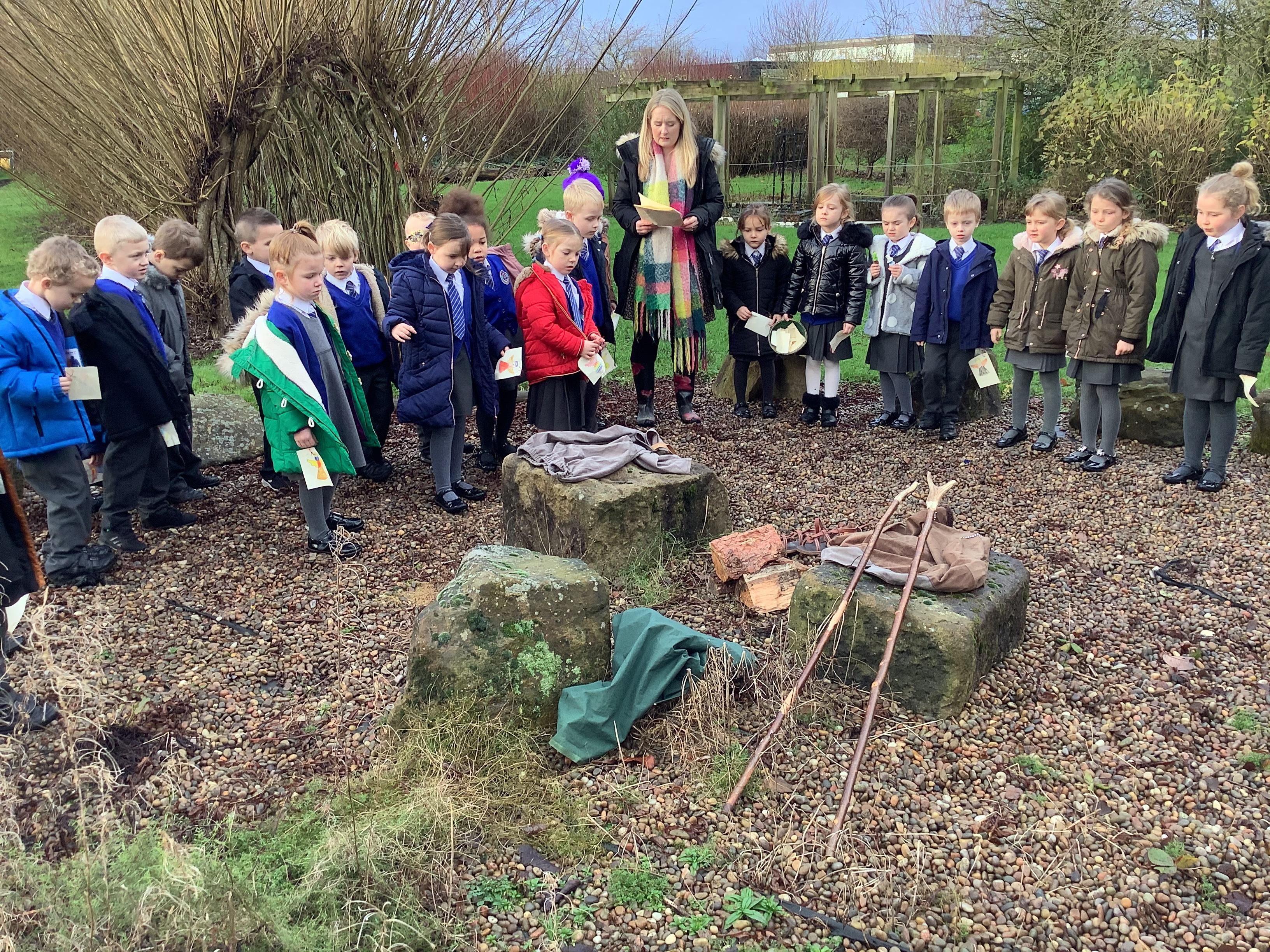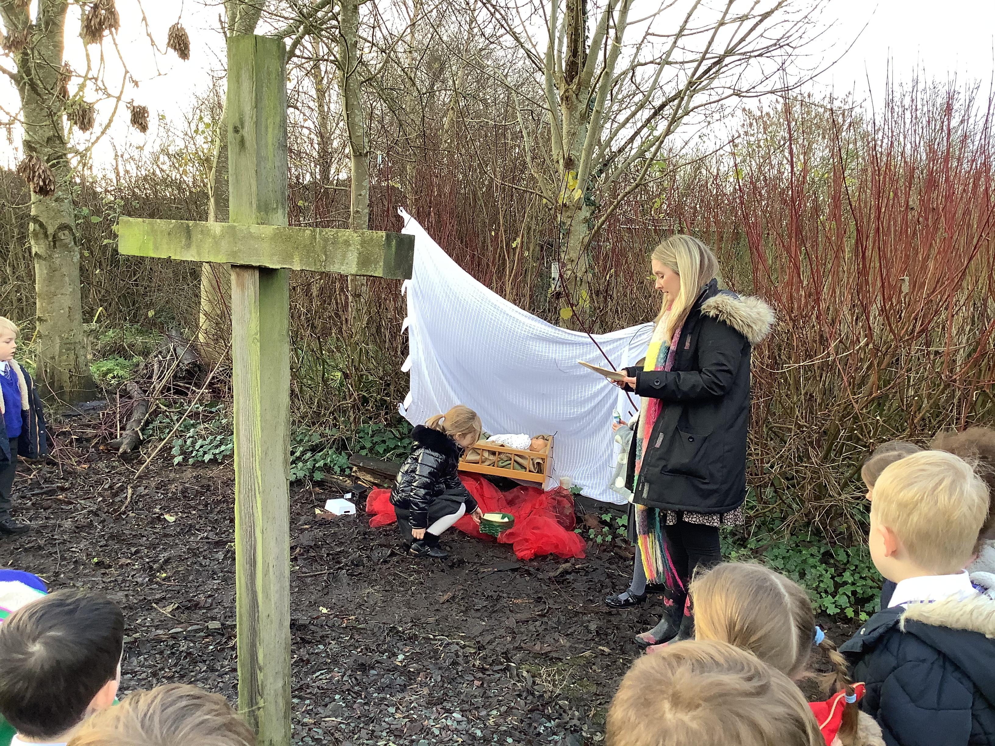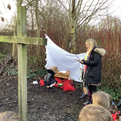 At Christmas we used our nature garden to follow the story of the First Christmas at our Christmas trail. We walked in the footsteps of the special people, chosen by God to be a part of that story and listened to their scripture. Before finally placing our gifts at the foot of the crib for Jesus, the precious gift God sent to guide us.